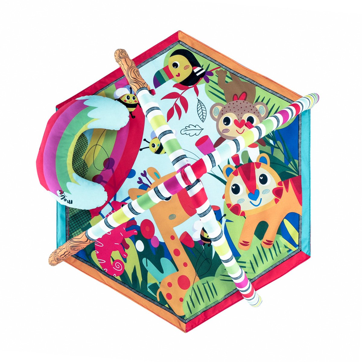 The various toys and figures on the mat contribute to the visual and cognitive development of little ones.